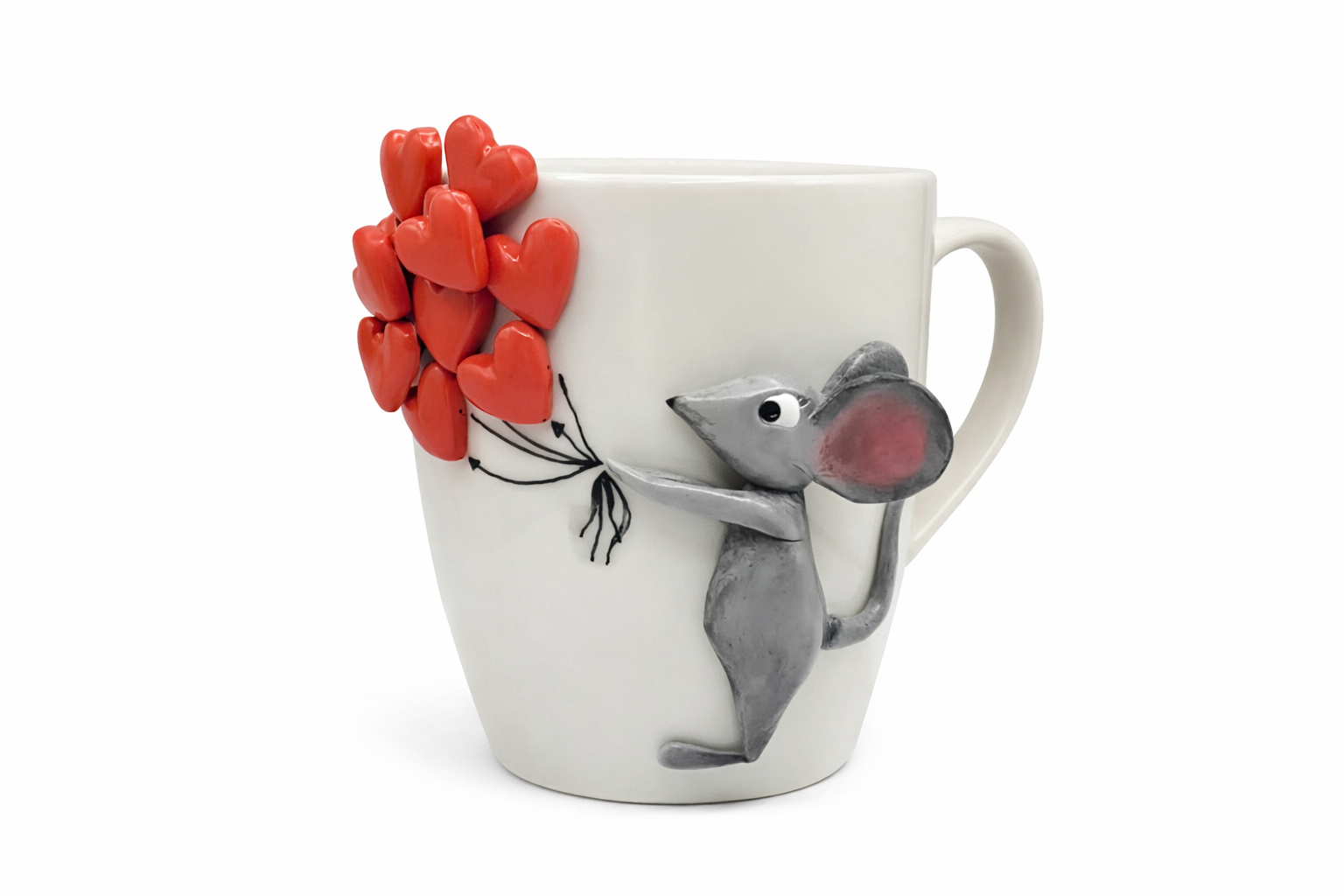 Balta krūze ar rokām darinātu polimērmāla pelīti un sārtiem sirds formas baloniem- jauka ideja dāvanai ikdienas tējas vai kakao baudīšanai.