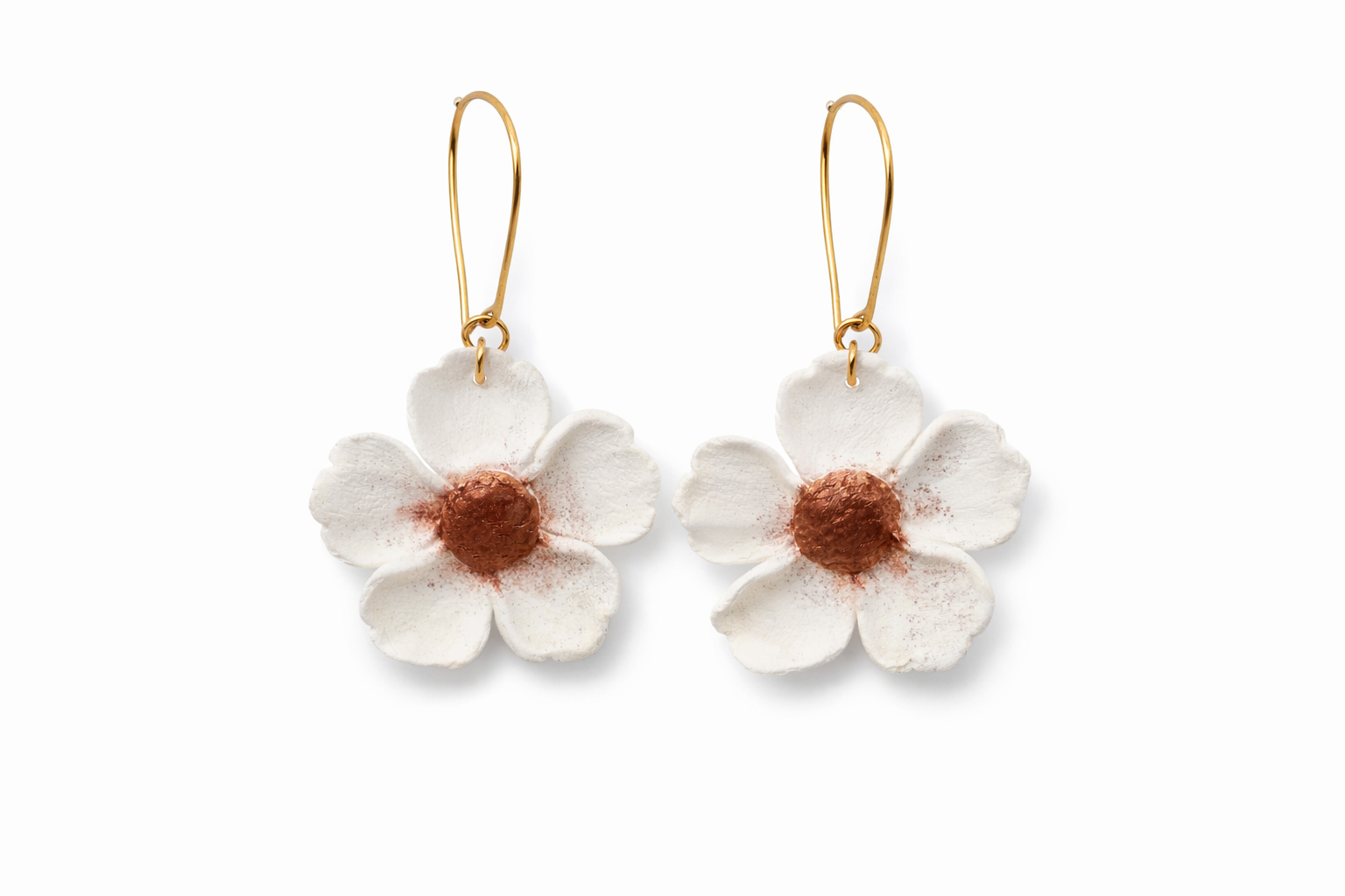Baltie ziedu auskari izgatavoti no polimērmāla, pateicoties tam tie ir viegli.